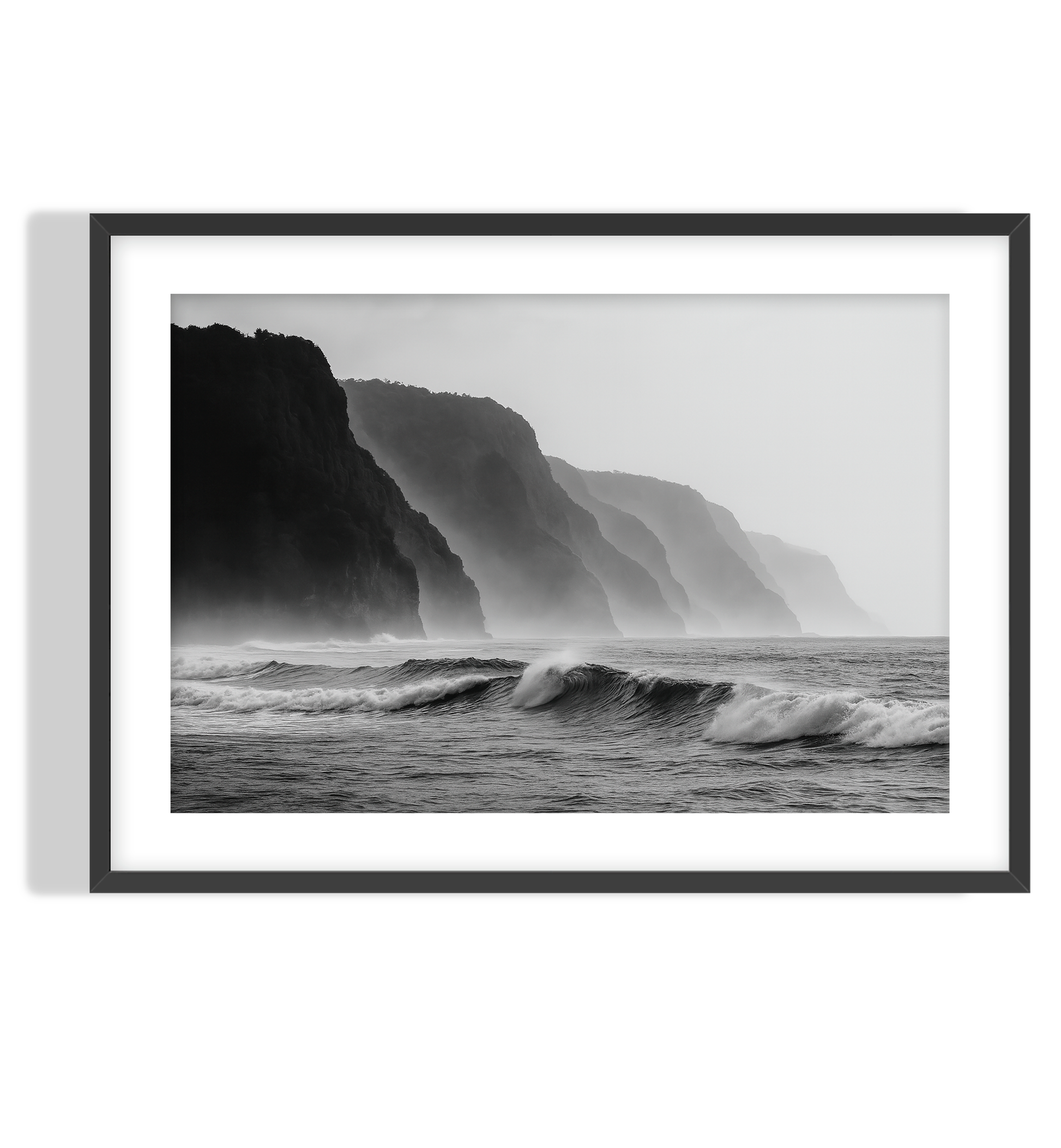 This black and white coastal art print captures dramatic ocean waves crashing against misty cliffs, creating a sense of depth and power. A striking piece that blends raw natural beauty with timeless monochrome elegance.
