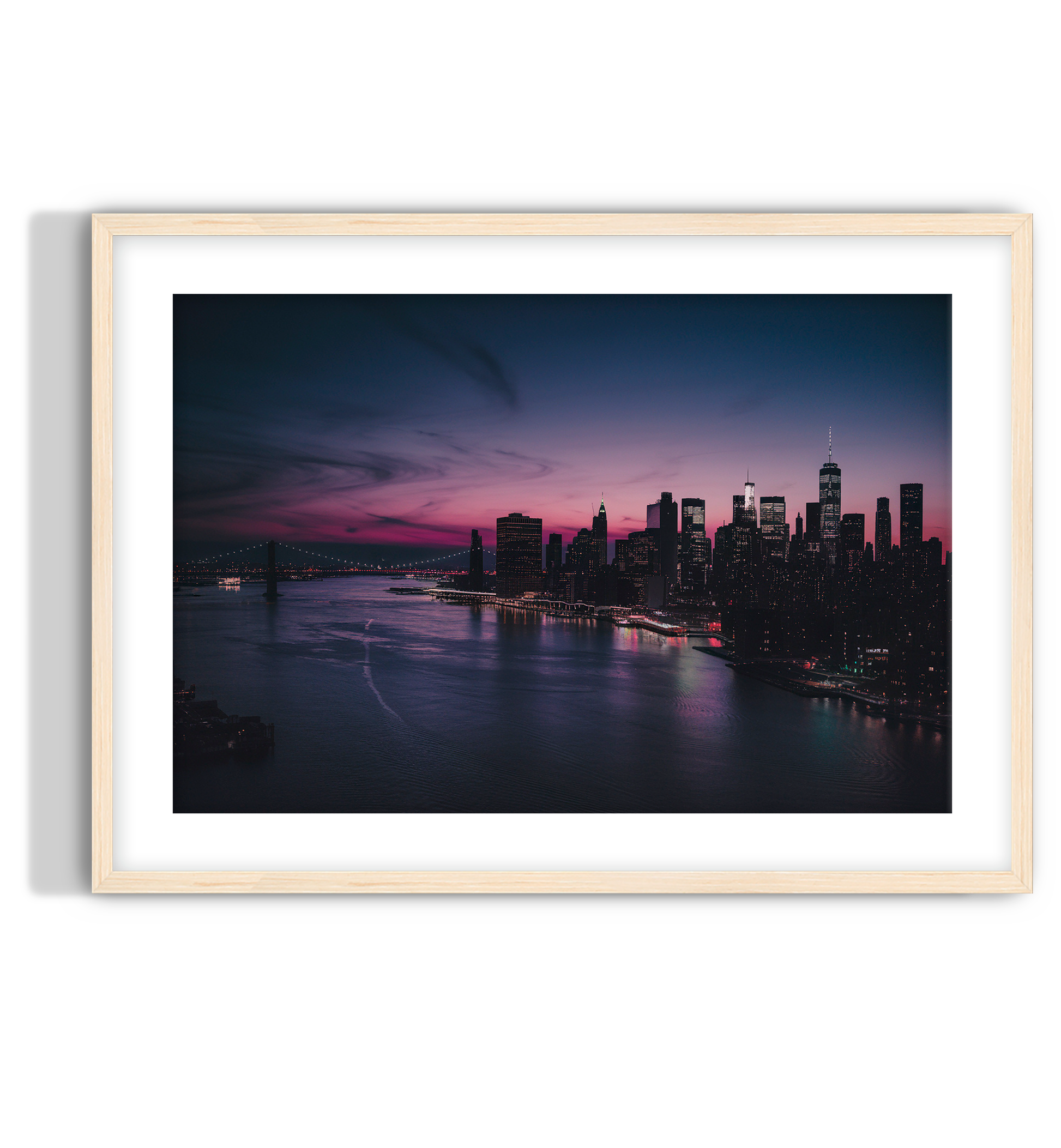 A portrait of the New York City skyline as night descends, with deep midnight blue and purple hues illuminating the sky behind the towering skyscrapers. New York City skyline wall art
