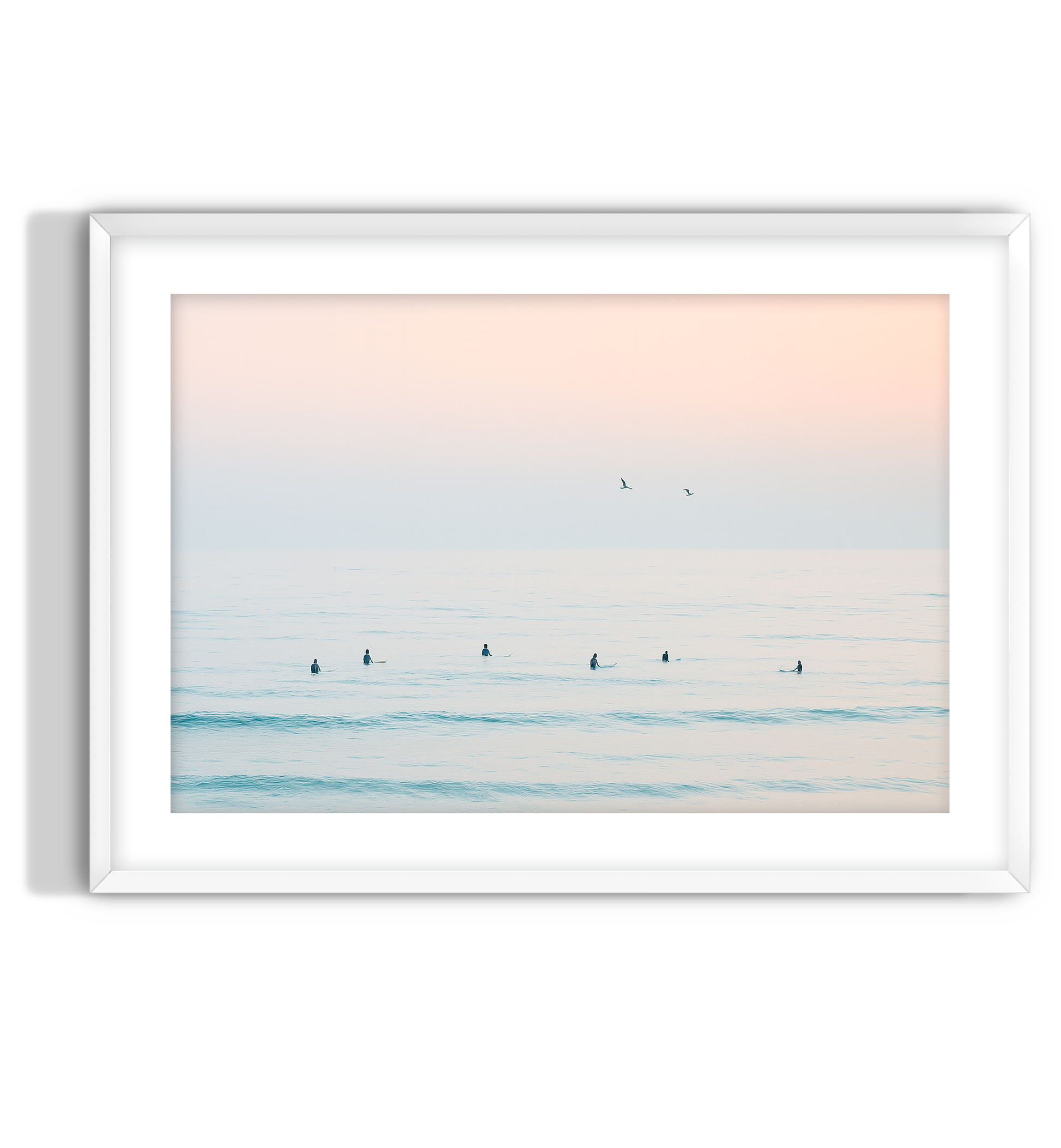 This serene art print captures surfers waiting on calm waters beneath a pastel colored sky. A peaceful and minimalist scene that evokes relaxation and coastal tranquility for any space.