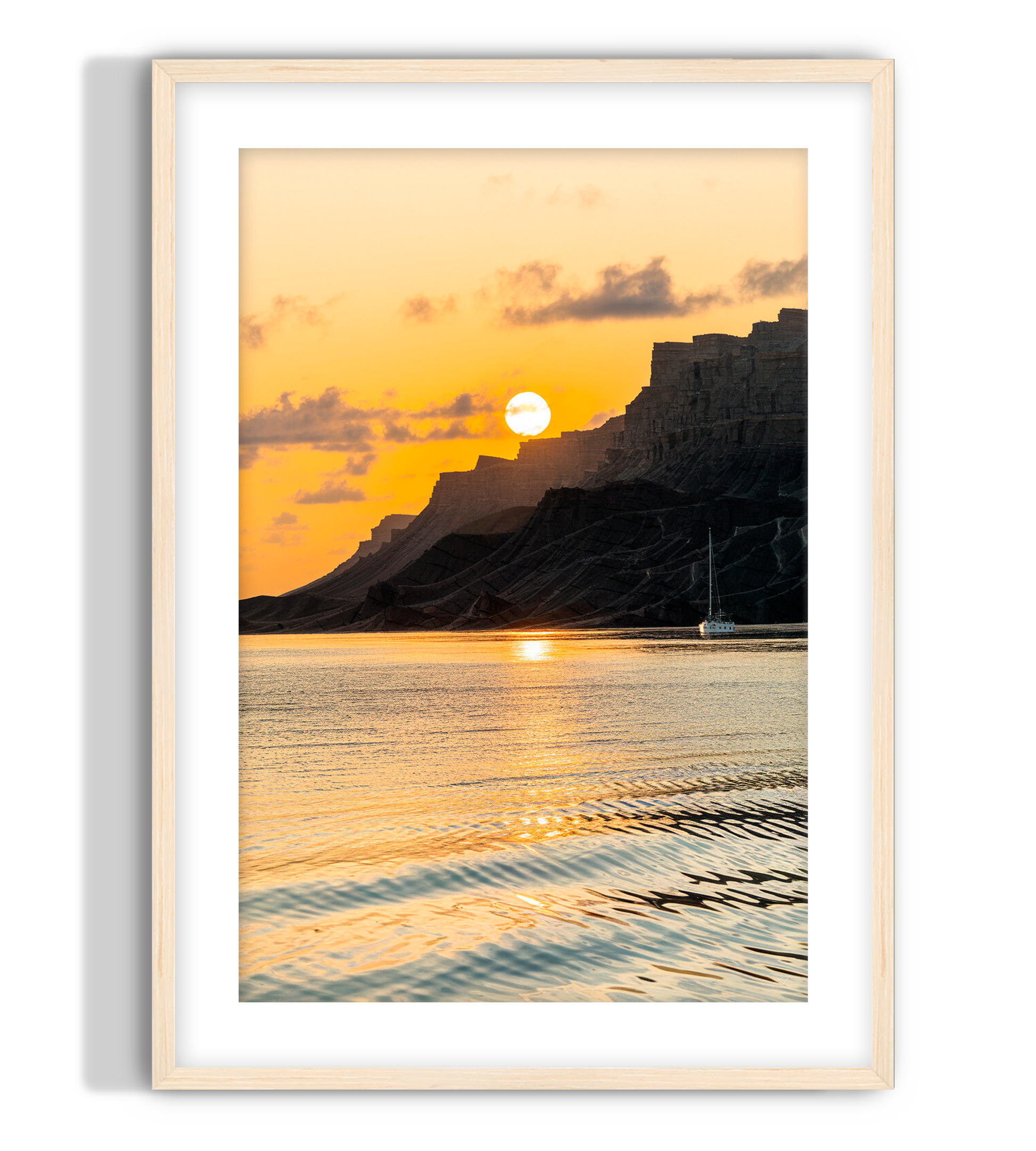 A print of the sun setting behind a cliffside during golden hour. The golden hue of the sun lights up the sky and shimmers off the ocean bay. Golden hour wall art.