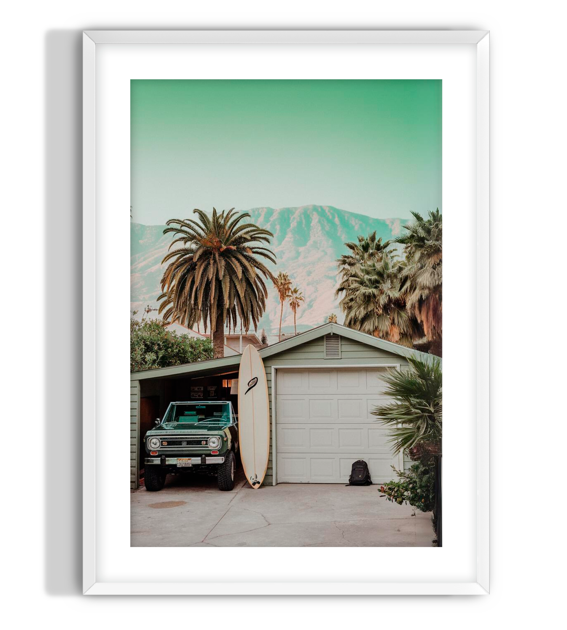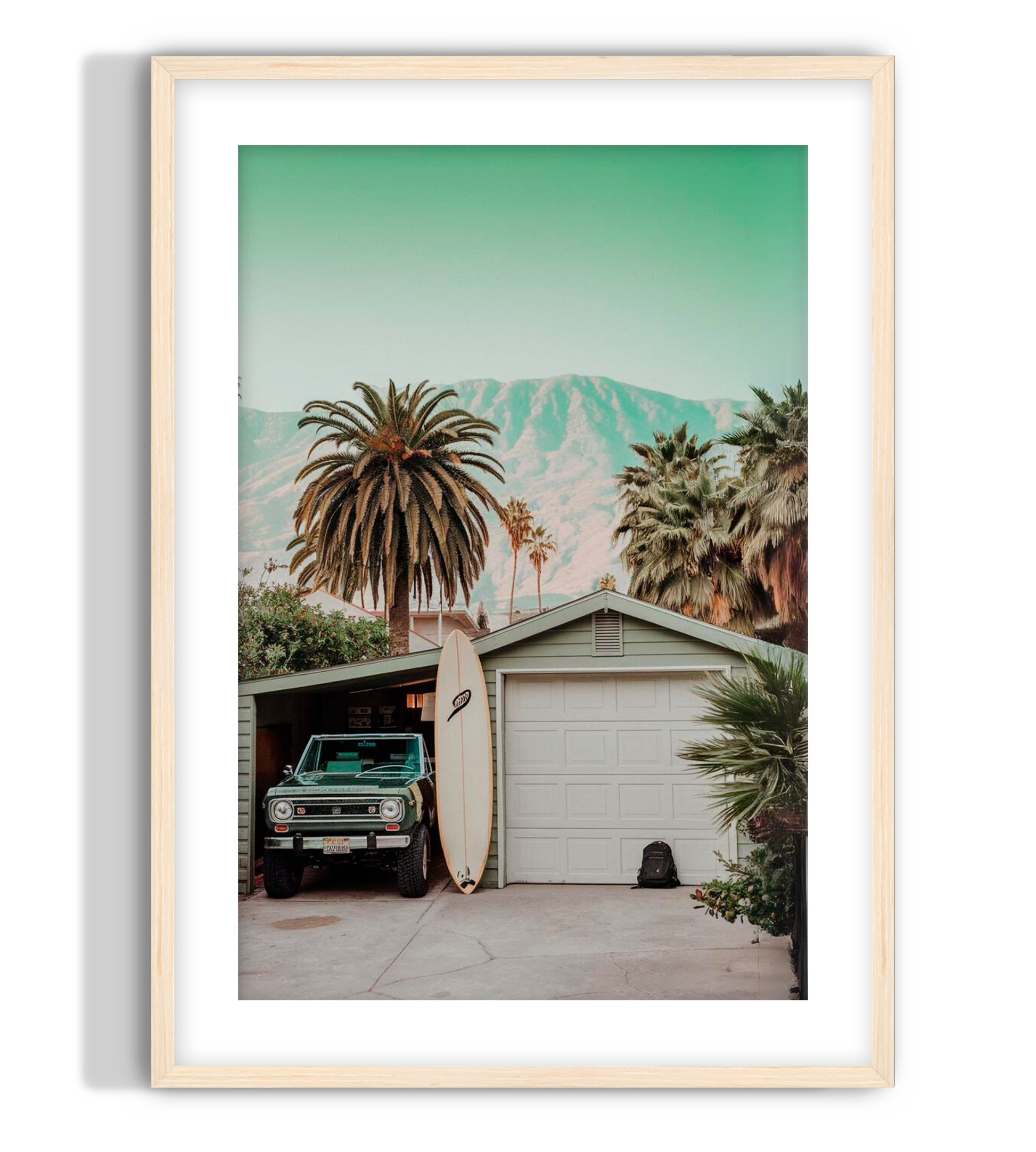 A portrait inspired by Animal Kingdom of a green truck in a garage with a green mountain in the background coming together in a scenic display.