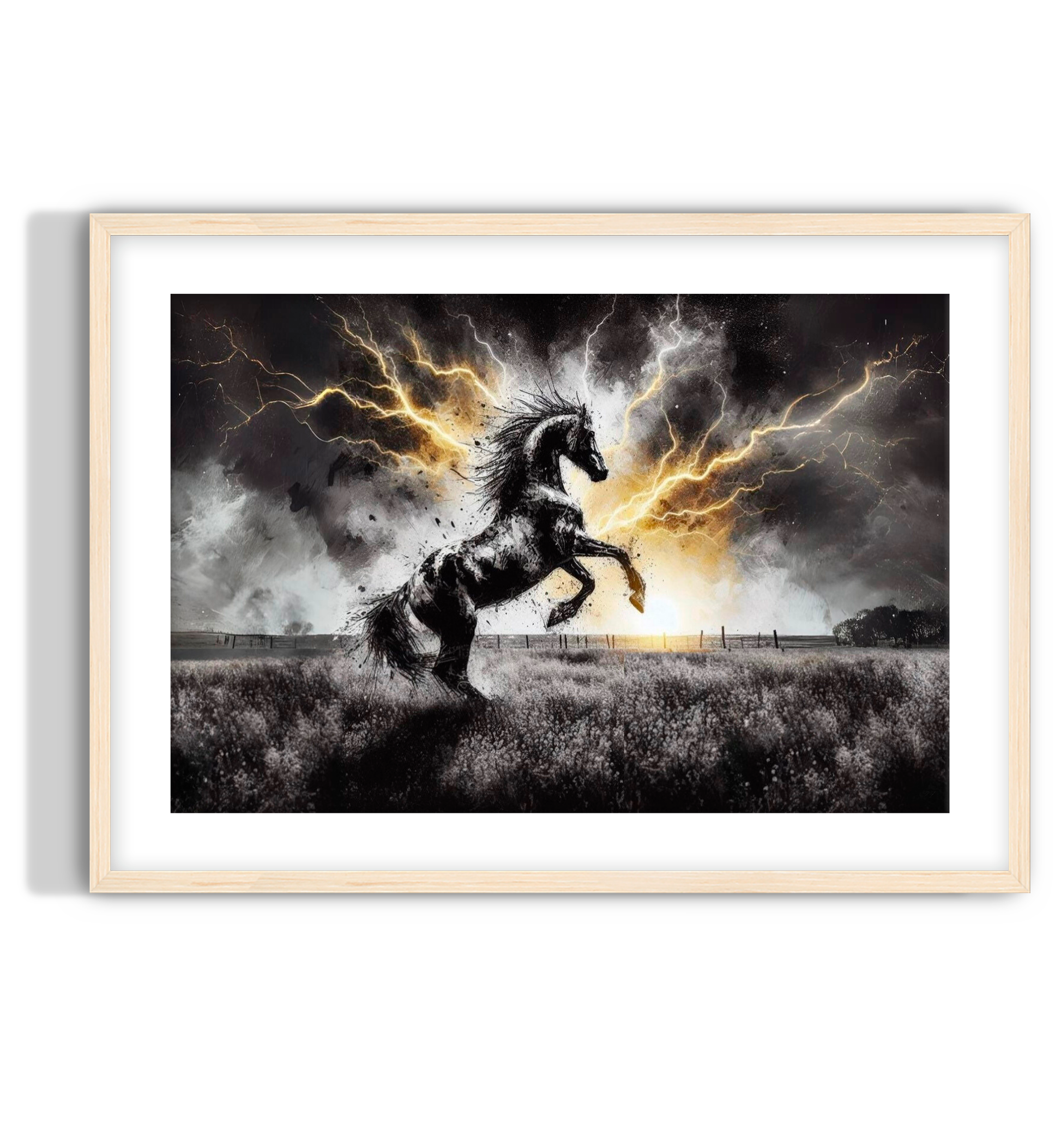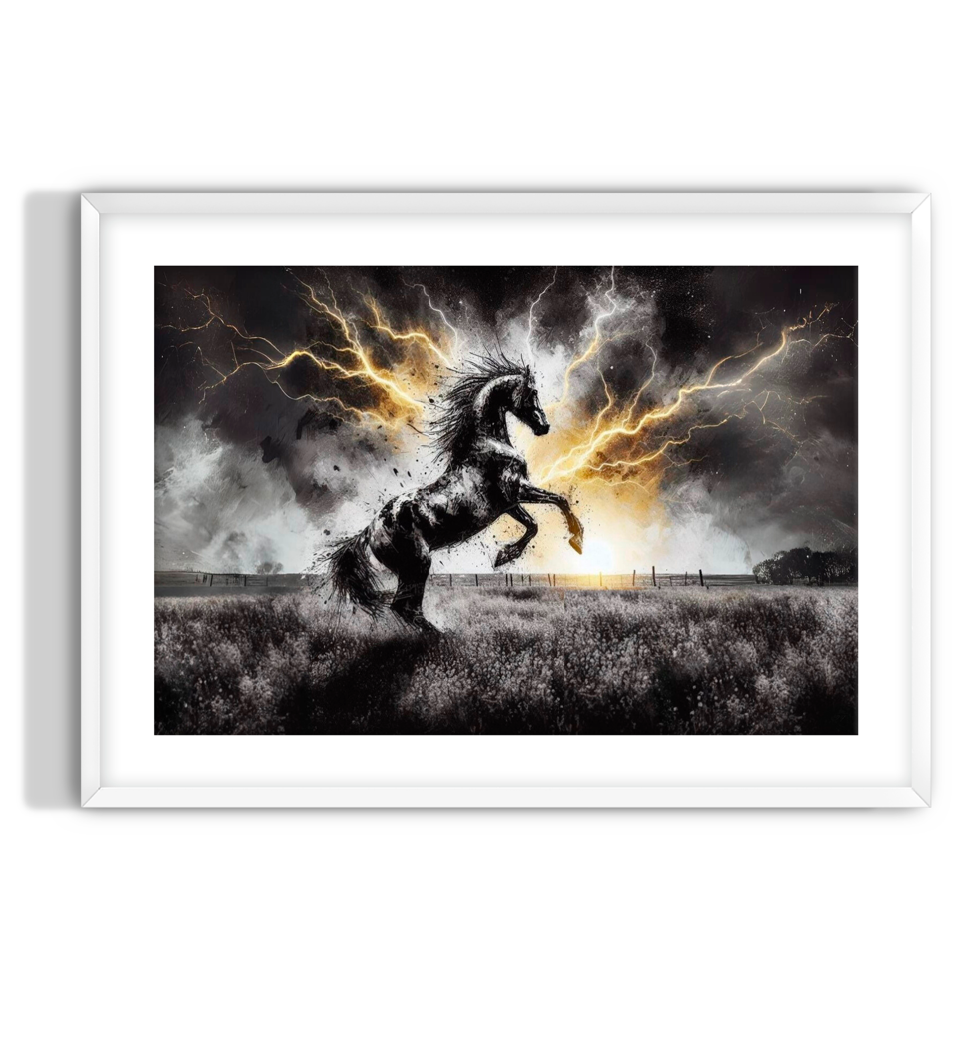 An abstract depiction of a wild Friesian horse, with bright yellow lightning accentuating its power and intensity. Friesian horse wall art