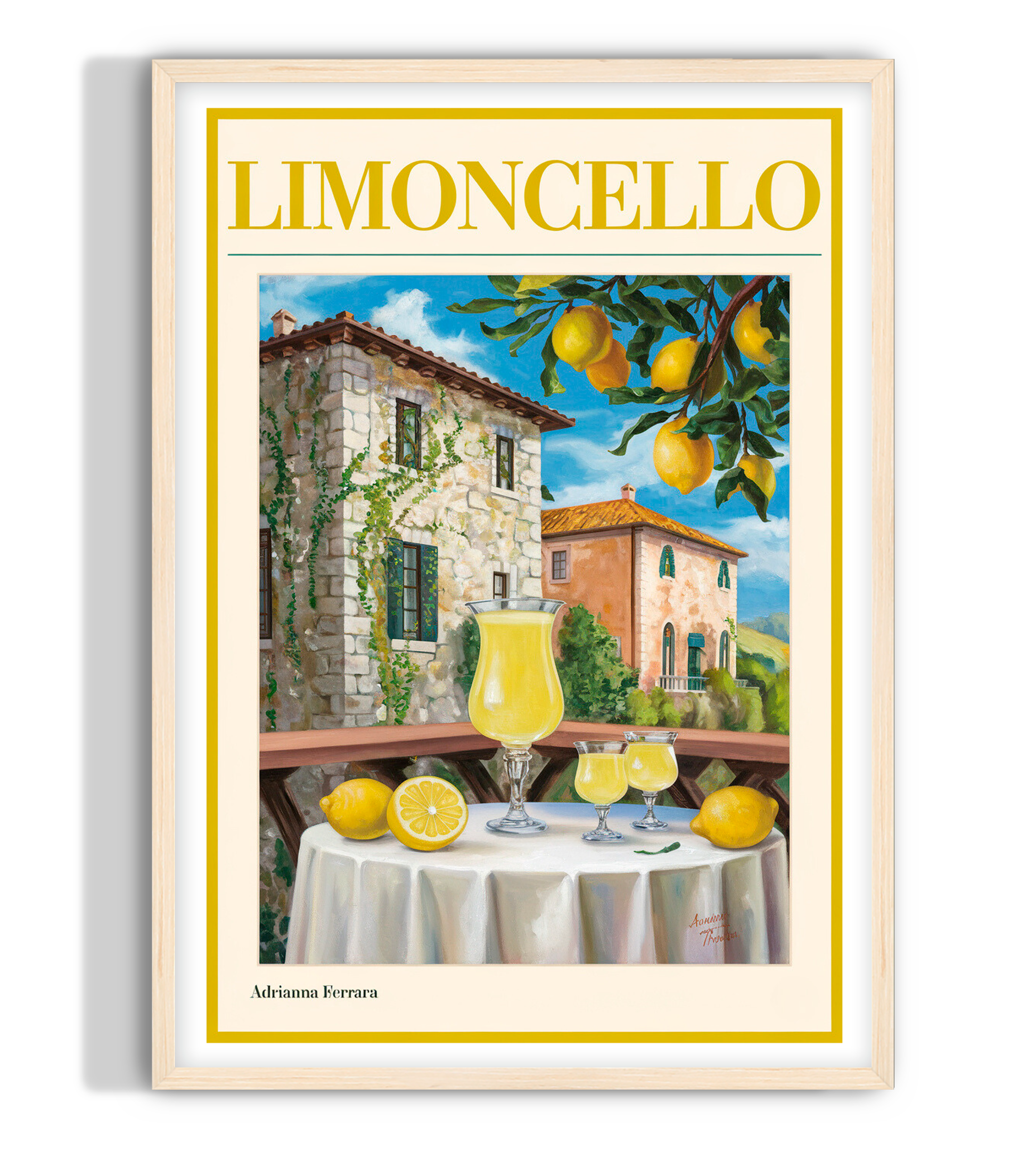 A portrait of fresh limoncello served on an Italian countryside. There are two stone villas as well as a lemon tree hanging down. Limoncello wall art
