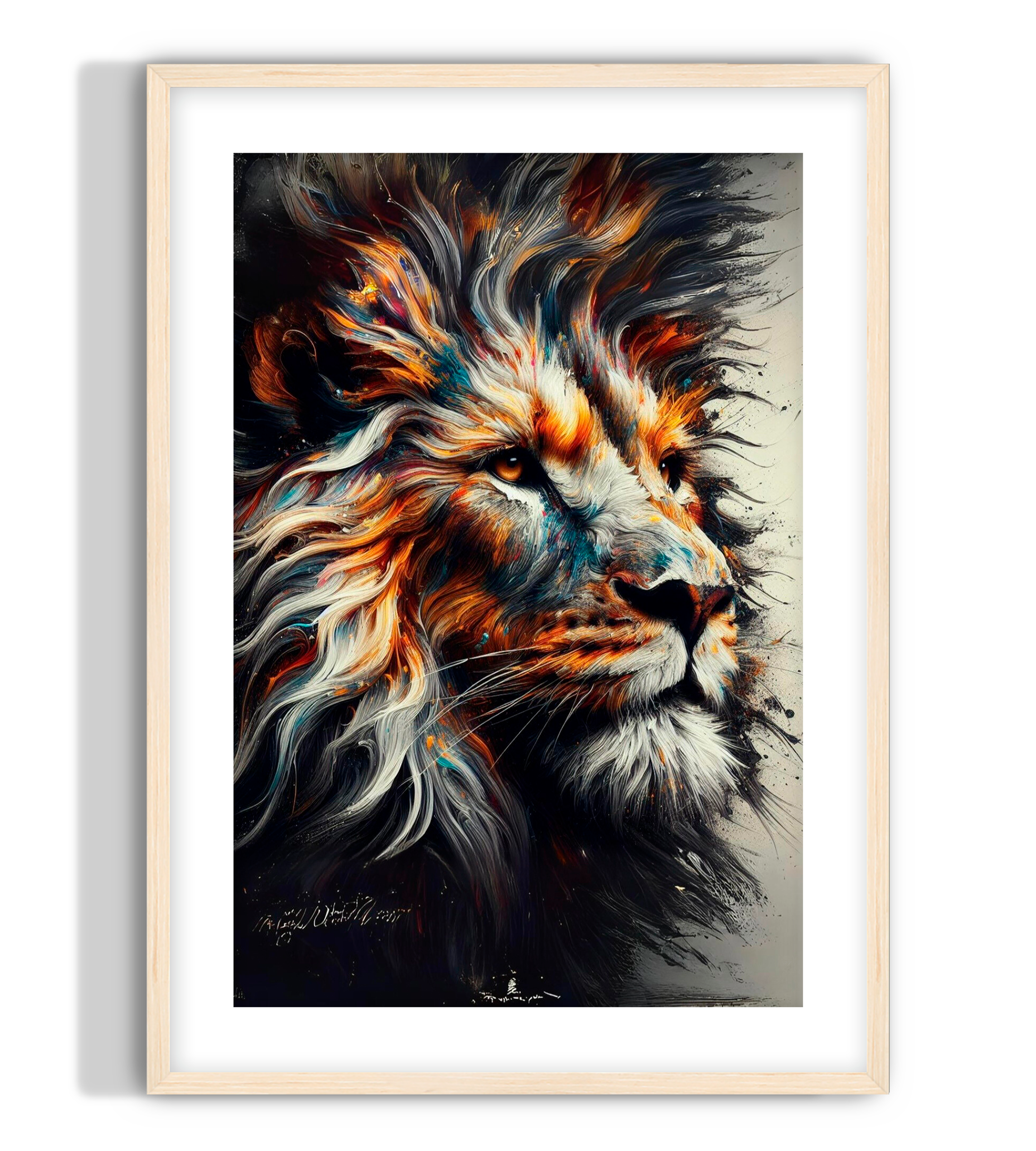 A close-up portrait of a lion, brought to life with vibrant color and a calm, commanding intensity. Lion mane wall art