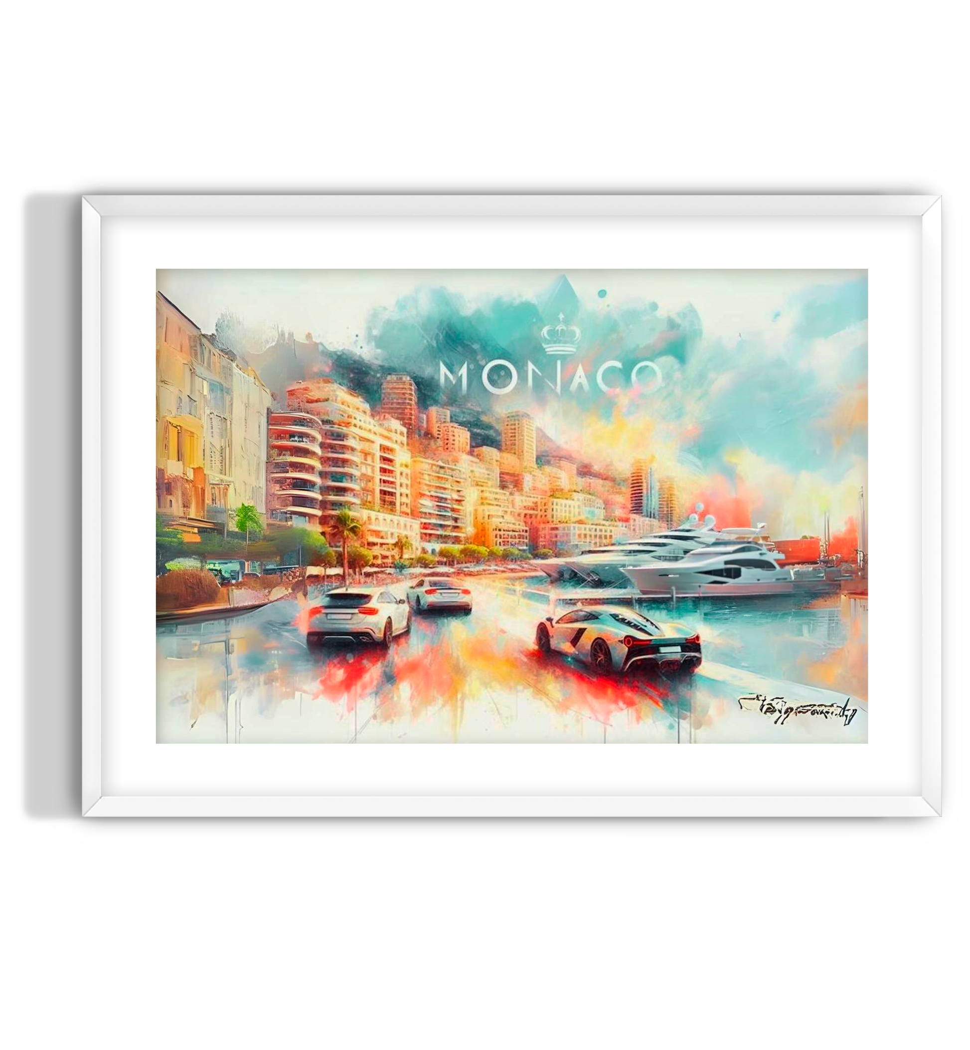 An abstract portrait depicting the wealth of Monaco featuring yachts and supercars in a bright color-way. Monaco wall art