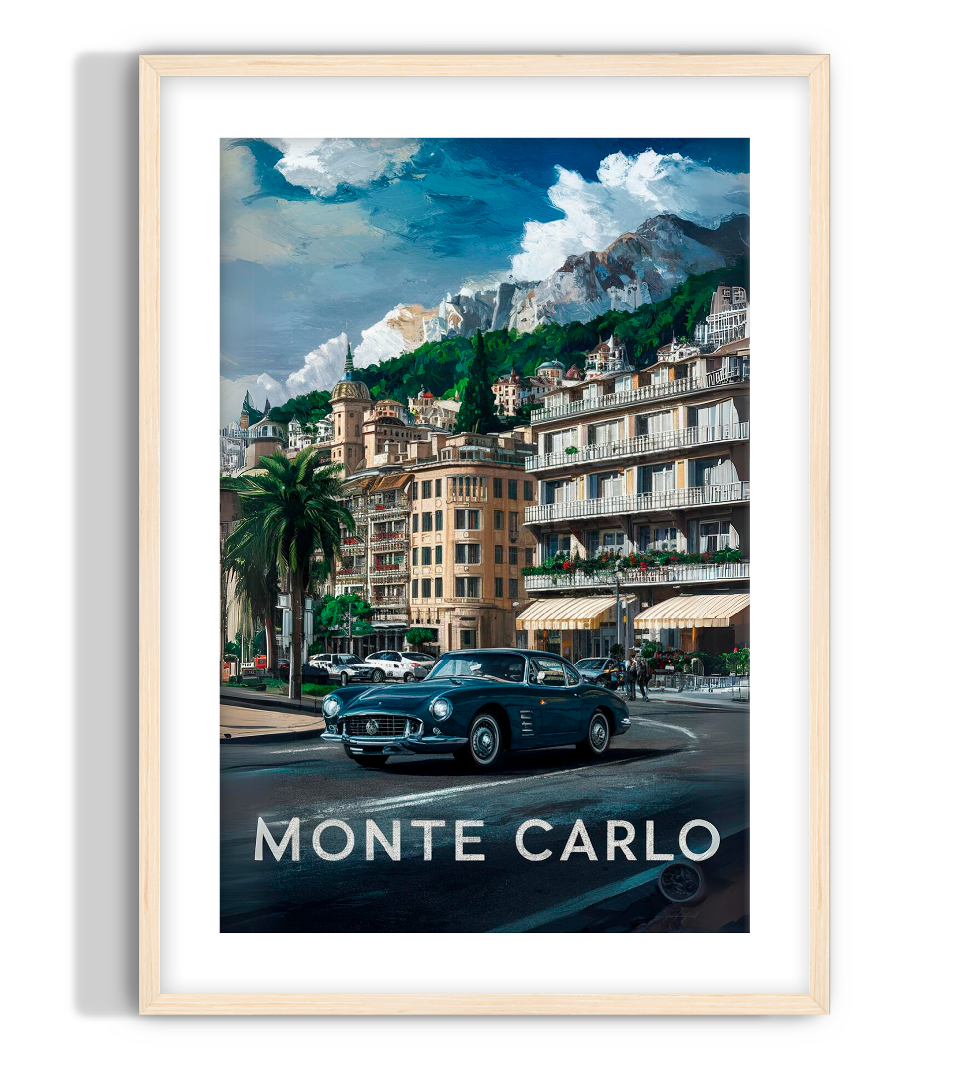 A stylized rendition of the streets of Monte Carlo, Monaco, featuring a close-up of a luxury automobile. The scene is framed by elegant shops, charming houses, palm trees, and a dramatic cliffside above. Monte Carlo wall art