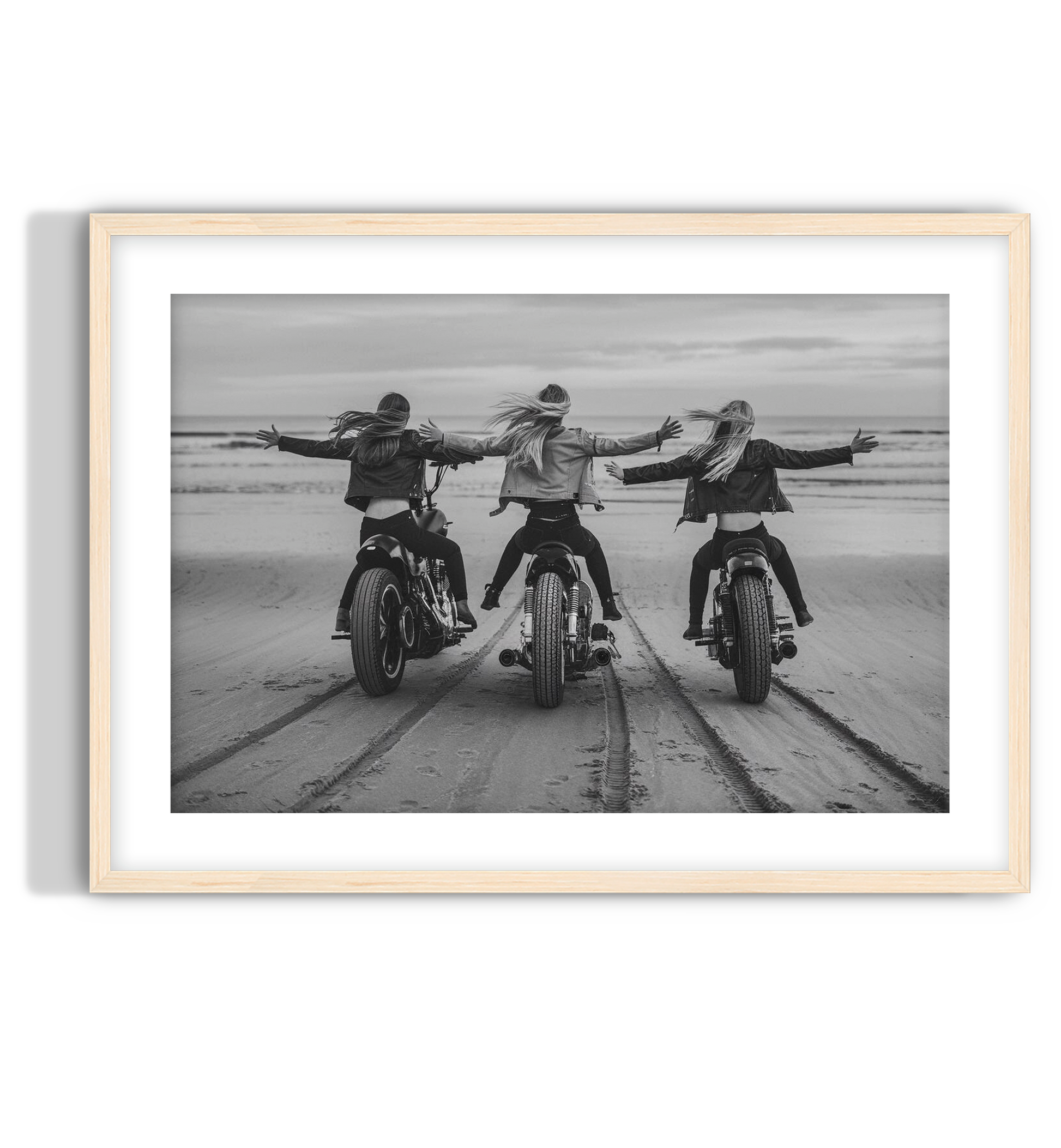 A black and white print of three girls riding motorcycles along the shore, capturing the essence of freedom and untamed spirit. motorcycle beach wall art