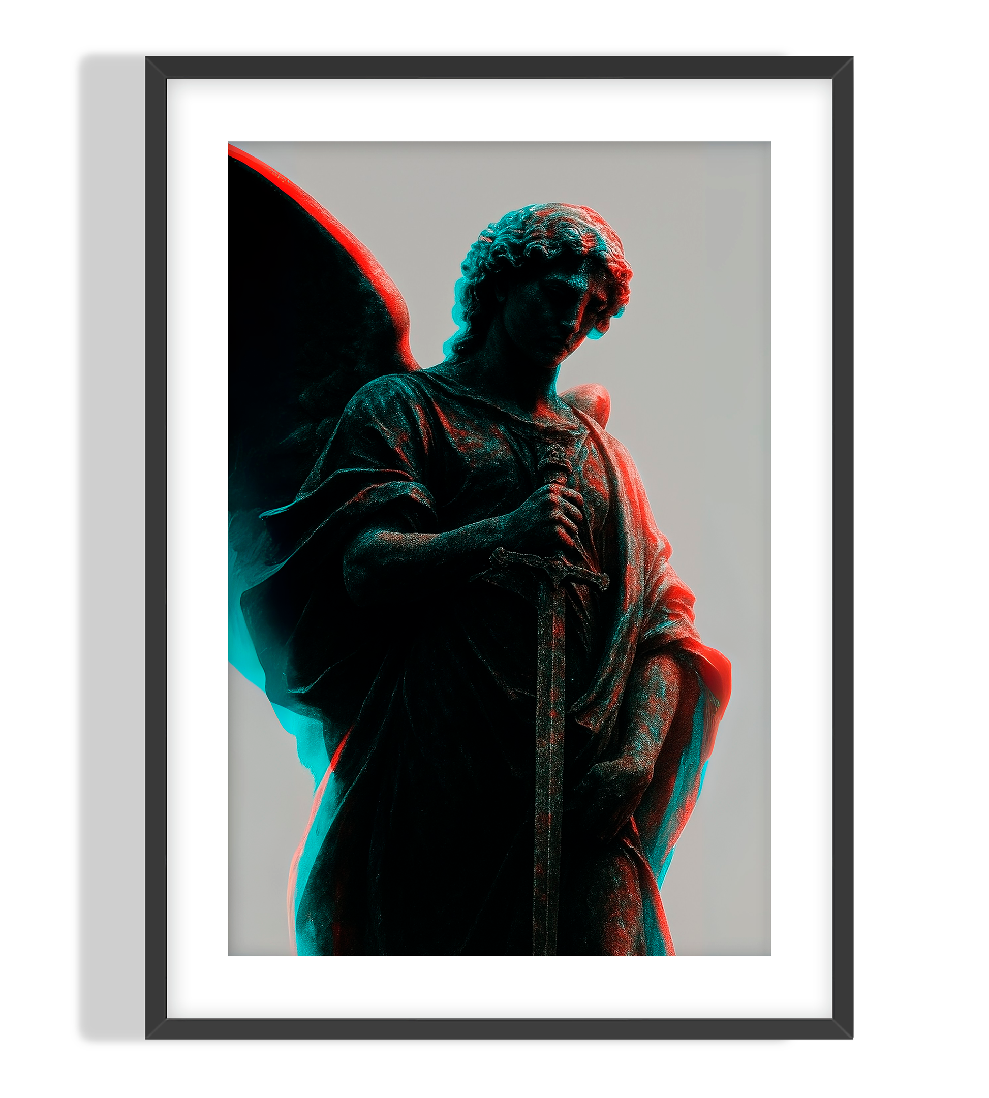A striking art print depicting. a powerful angel statue enhanced with blue and red accents. A dramatic piece that blends strength and contemporary style.