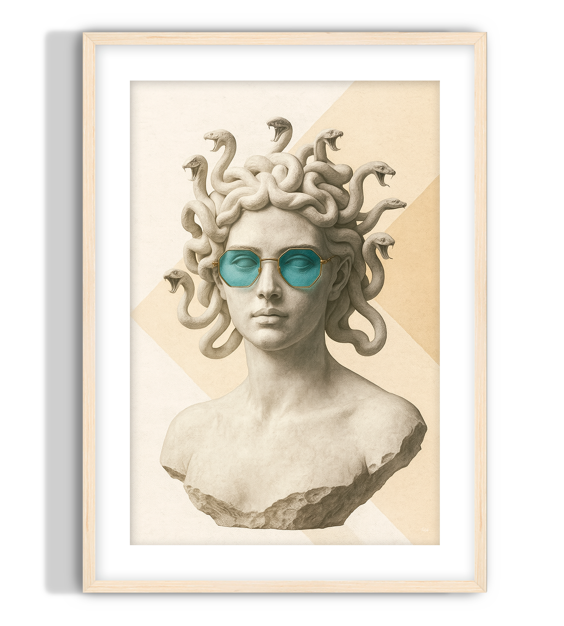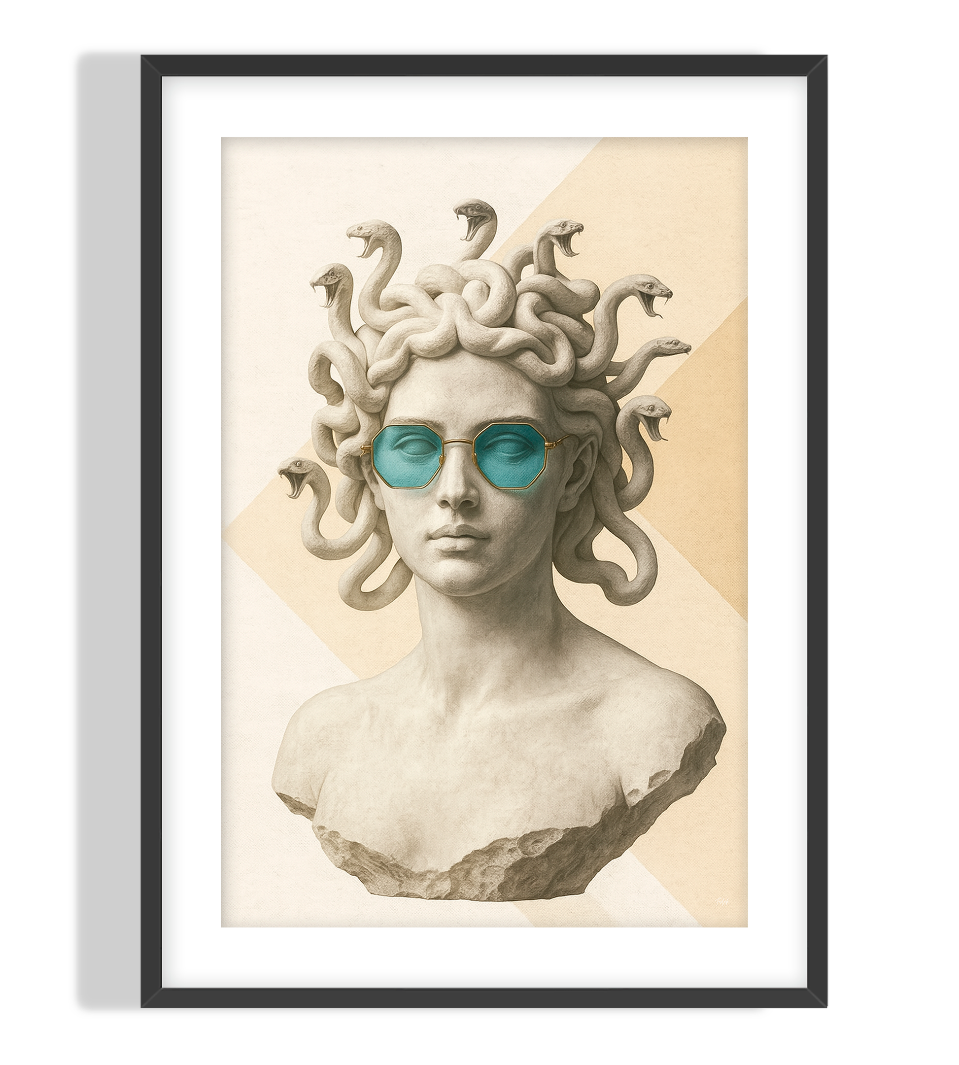 A modern art print of the mythological Medusa with snake hair and striking blue designer shades. A fusion of classical sculpture and contemporary style. Perfect for any space.