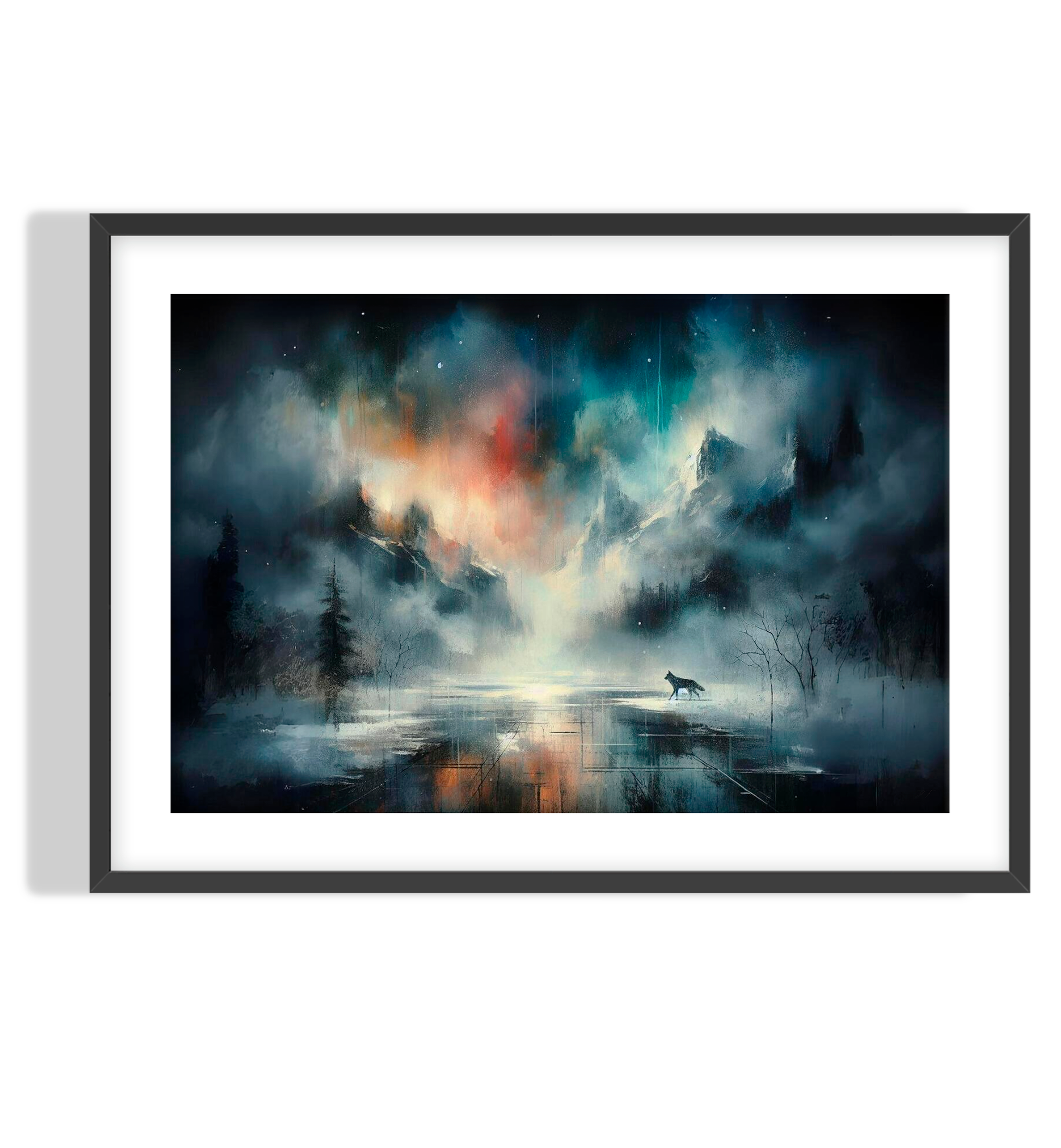 An abstract portrait of a wolf walking through a frozen tundra with mountains in the background